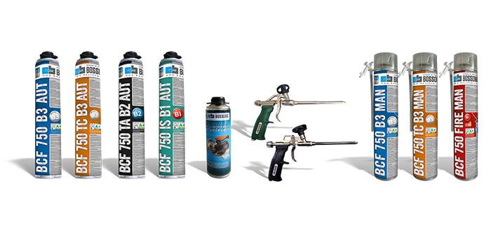BCF 750 sind die Mono-Komponenten-Schaumpalette, der Härtung gegenüber Feuchtigkeit reagiert. BCF 750-Schaum klebt alle Baumaterialien außer Polyethylen, Silikon, Öle und Fette, Trennung Produkte oder ähnliches. FCKW-HCFC frei. Klassifikation COV A+ in Übereinstimmung mit der Französischen Verordnung. Der Schaum muss von den UV-Strahlen nach der Anwendung geschützt werden. Seiner thermischen und schalldämmenden Werte sind hervorragend. Produkte sind in der manuellen (MAN) oder automatischen Version (AUT) verfügbar.